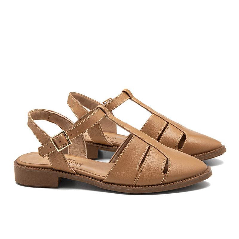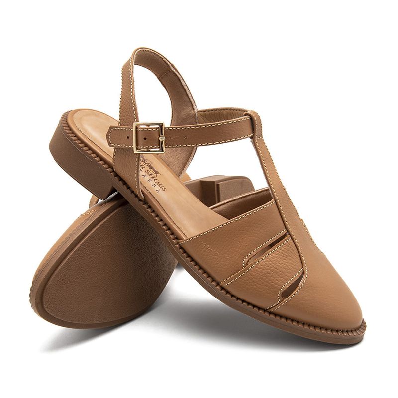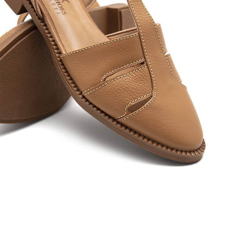 O modelo apresenta design fechado na parte frontal com recortes laterais, que proporcionam leveza e melhor ventilação para os pés. A tira central traz um toque de elegância ao visual, enquanto o acabamento em couro macio valoriza ainda mais o estilo do calçado.
